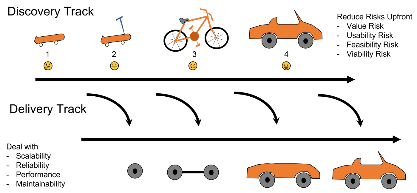 Beim Dual Track Development geht es darum das Risiko möglichst früh aus dem Entwicklungsprozess zu nehmen, ohne dabei andere wichtige Produktentwicklungsaufgaben zu vernachlässigen. Das gelingt, indem die Entwicklungsaufgaben in zwei Themengebiete mit verschiedenen Zielen aufgeteilt werden.