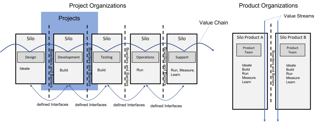 In Produktentwicklungsorganisationen ist das anders, hier entstehen zwar auch Silos, jedoch entstehen sie entlang von Geschäftsmodellen und Produkten entlang des Value-Streams. Eine Interdisziplinäre Zusammenarbeit innerhalb dieses Value-Streams ist somit gewährleistet.