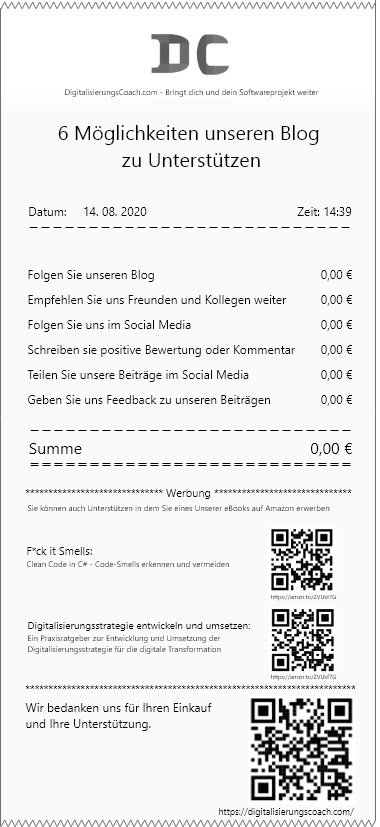 Schön dass Sie zum ersten Mal da sind. DigitalisierungsCoach bietet Ihnen interessante Informationen zum Wissensaufbau im Bereich Digitalisierung, digitale Transformation, Software-Engineering und Produktmanagement. Und das ganze kostenlos. Wenn Sie mich oder meinen Blog Unterstützen wollen, denken Sie bitte darüber nach eines meiner Bücher zu kaufen. Danke und viel Spass beim Wissenaufbau.