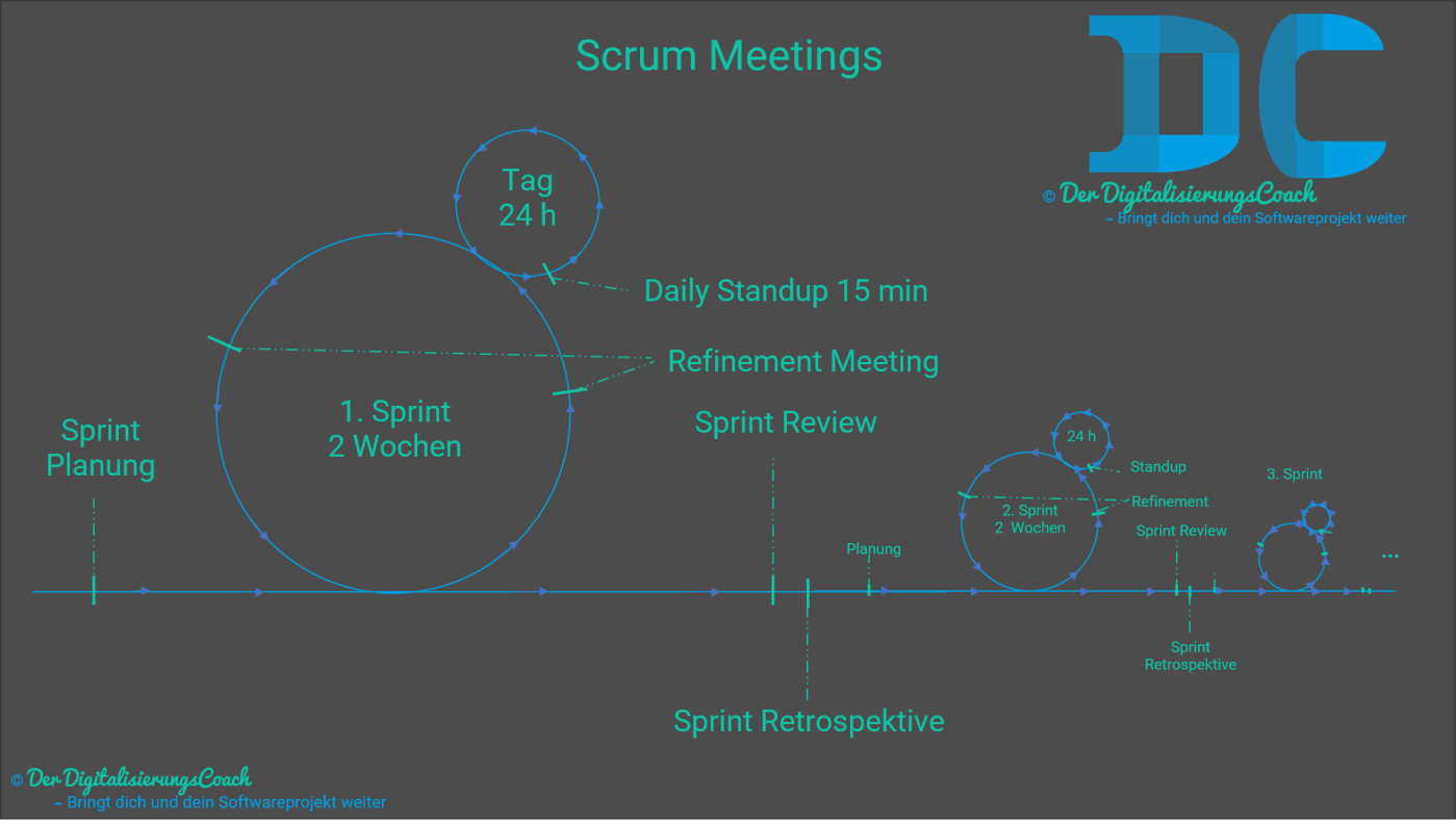 Scrum ist ein iterativ inkrementeller, agiler Entwicklungsprozess. Scrum zerteilt also ein monolithisches großes Projekt in viele kleine Mikroprojekte, sogenannte Sprints. Ein Sprint dauert üblicherweise zwischen zwei und vier Wochen und stellt einen kompletten Projektdurchlauf dar. Also einen Durchlauf von der Planung, über das Design und die Konzeption bis hin zur Implementierung, dem Testen, der Release-Erstellung und der Abnahme durch den Product-Owner. Dabei gibt Scrum 5 Meetings vor die während des Sprints abgehalten werden.