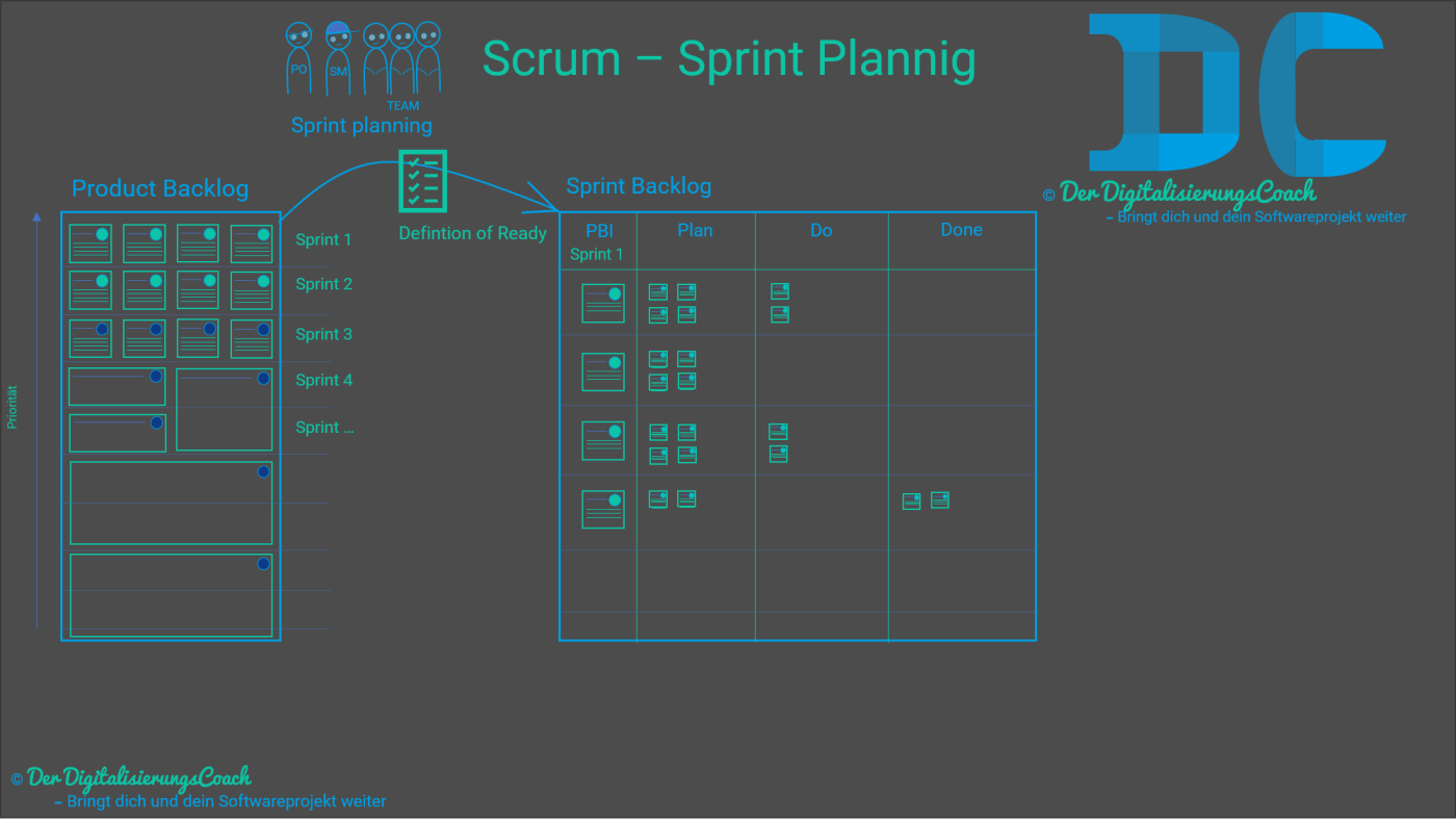 Bei der Sprint Planung erstellt das Team gemeinsam mit den Product-Owner das Sprint-Backlog. Dazu wählt es gemeinsam mit dem Product-Owner die am höchsten priorisierte Product-Backlog Items (PBIs) aus den Produktbacklog, welche die Definition of Ready erfüllen. Es können nur PBIs verplant werden, die die Definition of Ready erfüllen. Der Product-Owner präsentiert jedes geplante PBI und bespricht es mit dem Team. Das Team stellt solange Fragen, bis es die Spezifikation voll und ganz verstanden hat und keine Unklarheiten mehr herrschen. Ein Minimumbestandteil der Defintion of Ready ist eine Aufwandsschätzung die vom Team während des Planning Pokers in Refinementmeetings gemacht wurde. Diese Aufwandsschätzung wird zur Planung des Sprints herangezogen. Es werden nur so viele PBIs in den Sprint hineingezogen und im Sprintbacklog verplant wie es das Team auch realistisch innerhalb des Sprints umsetzen kann. Der Aufwand ist somit maximal so hoch, wie es das Team mit seiner Velocity innerhalb eines Sprints abarbeiten kann. Ist das Sprintbacklog geplant, so kann sich das Team auf das Sprintziel commiten und eine Detailplanung am KANBAN-Board durchführen. Sollten hier gewisse Dinge unter- oder überschätzt worden sein, so kann nochmals mit dem Product-Owner gesprochen werden und noch weitere PBIs hinzugezogen werden, oder bestehende weggenommen werden. Wenn das Team sich danach auf das veränderte Sprintziel commitet kann mit der Umsetzung begonnen werden.