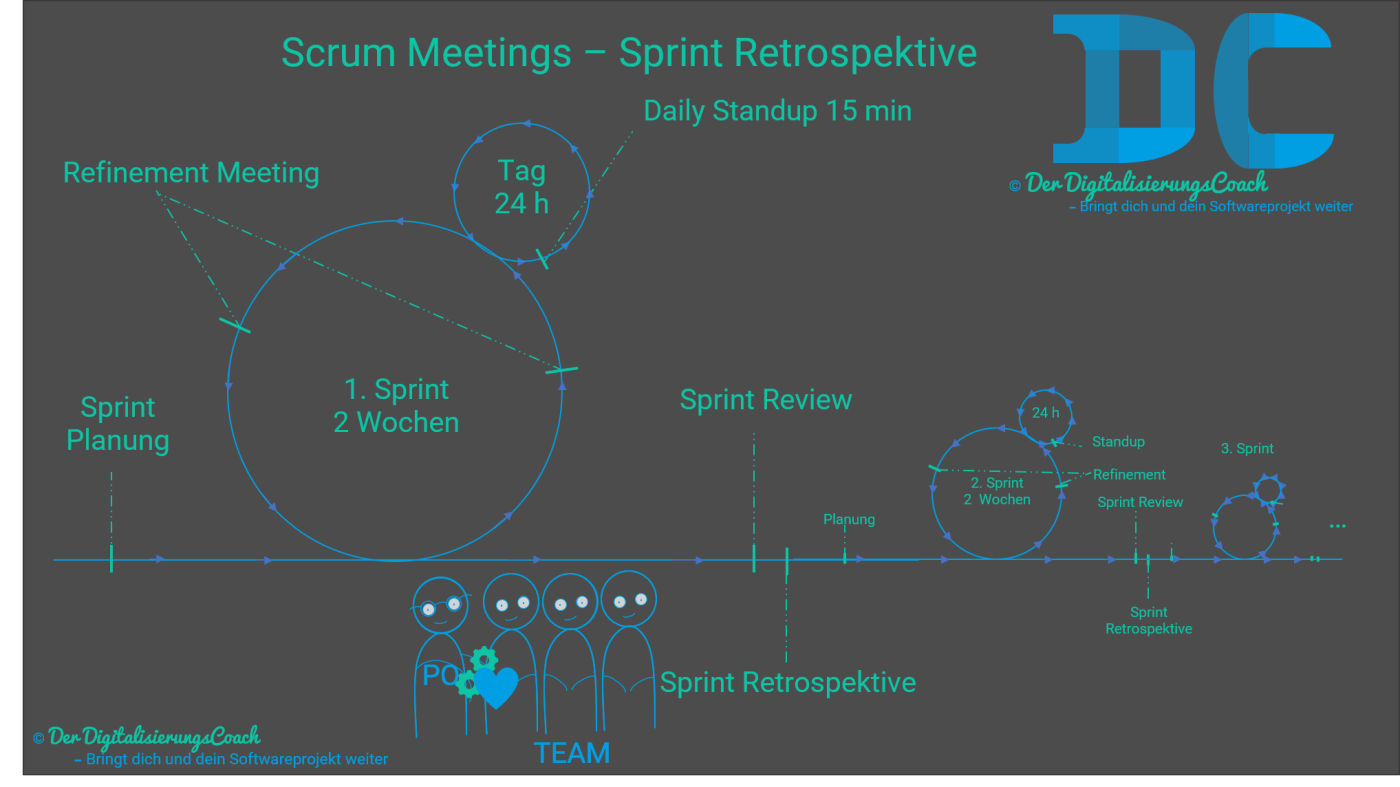 Die Retrospektive ist ein sehr wichtiges Meeting, welches erfahrungsgemäße in der Praxis leider sehr oft weggelassen wird. Es ist aber eine wichtige Stellschraube bei Scrum um ein Projekt langfristig erfolgreich und effizient umsetzen zu können. Sprint Retrospektiven werden wie Sprint Reviews nach jedem Sprint abgehalten und haben im Gegensatz zum Review, welches sich auf das Produkt fokussiert, einen Fokus auf den Prozess und die gemeinsame Arbeit und den Umgang miteinander. Die Retrospektive ist also eine Reflexion des vergangenen Sprints und ein Ableiten von Verbesserungsmaßnahmen und somit der Hauptbestandteil eines kontinuierlichen Verbesserungsprozesses. Bei der Retrospektive werden alle positiven und negativen Erfahrungen die während des Sprints gemacht wurden gesammelt und dokumentiert. Wurden spezielle Hindernisse gefunden so werden diese in ein Impediment-Backlog notiert und der Scrum Master tritt dafür ein, dass diese Hindernisse (vom Team) beseitigt werden. Das Team überlegt sich dann konkrete Verbesserungsmaßnahmen welches es beim nächsten Sprint besser umsetzen möchte und commitet sich deren Umsetzung. Um diesen Meeting etwas Struktur zu verleihen kann zum Beispiel die DAKI Methode angewendet werden.