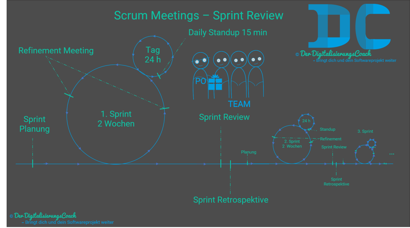 Das Sprint Review Meeting findet am Ende des Sprints statt. Jeder Entwickler präsentiert dem Product-Owner und den Key-Stakeholdern (User, interne Stakeholder anderer Unternehmensbereiche) am Ende des Sprints die Ergebnisse anhand eines lauffähigen Produkt-Inkrements. Der Product-Owner und die Key-Stakeholder überlegen, ob die entwickelten Features so passen, oder ob noch Details offen sind. In Ausnahmefällen kanne es sein, dass die Entwickler etwas falsch verstanden haben, oder das Feature noch unvollständig ist. Wenn alles passt, dann schließt das Team beim Review alle „fertigen“ Product-Backlog Items (=PBIs). Im Idealfall gibt es bei größeren Entwicklungen einen Staging-Mechanismus, bei dem Tests und Abnahmen auf einer eigenen QA-Stage stattfinden, die Entwicklung und die Produktiv-Umgebung aber eigene Stages sind. So kann der Product-Owner immer das aktuelle Produkt-Inkrement testen und dementsprechend Feedback geben. Er holt sich in dieser Phase auch aktiv Feedback von Key-Usern ein, deren Feedback er ebenfalls in die Produktentwicklung mit einfließen lässt. Bei Sprint Reviews geht es also hauptsächlich um das Produkt, das neue Produktinkrement. Im Gegensatz zum Wasserfall-Vorgehensmodell wird also bei Scrum versucht möglichst schnell Feedback vom Kunden, genauer gesagt vom Product-Owner, einzuholen und dieses wieder ins Produkt zurückfließen zu lassen.